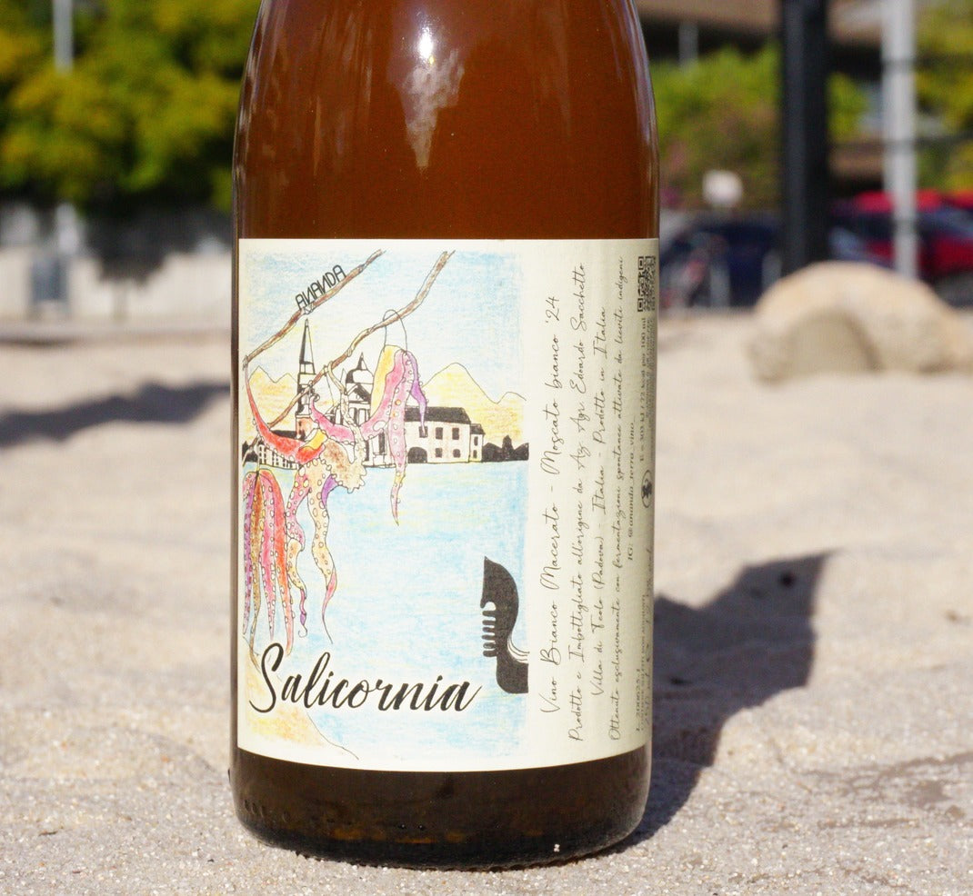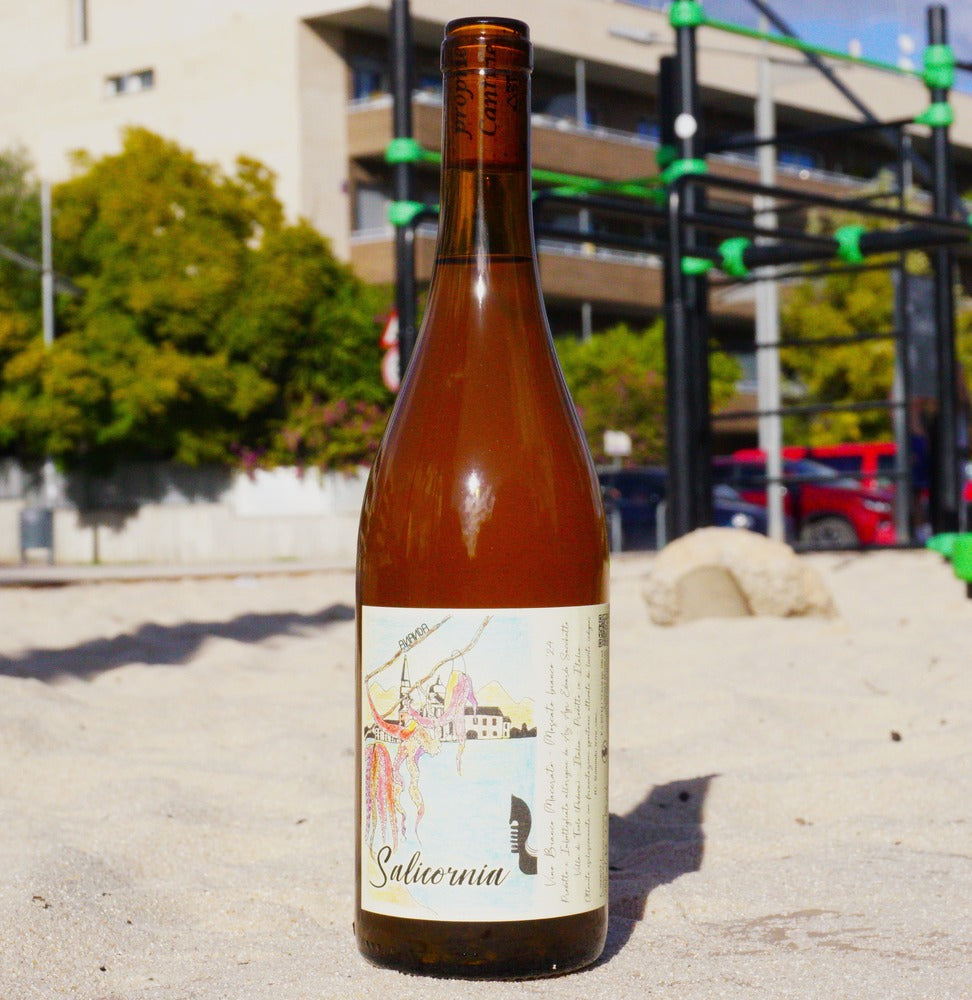 Salicornia es un vino blanco con maceración (orange) elaborado a partir de Moscato Bianco 2024, con un enfoque delicado y preciso. Las uvas se despalillan y maceran con las pieles durante 10 días, y el vino envejece posteriormente en fibra de vidrio, preservando al máximo la pureza aromática y la frescura.